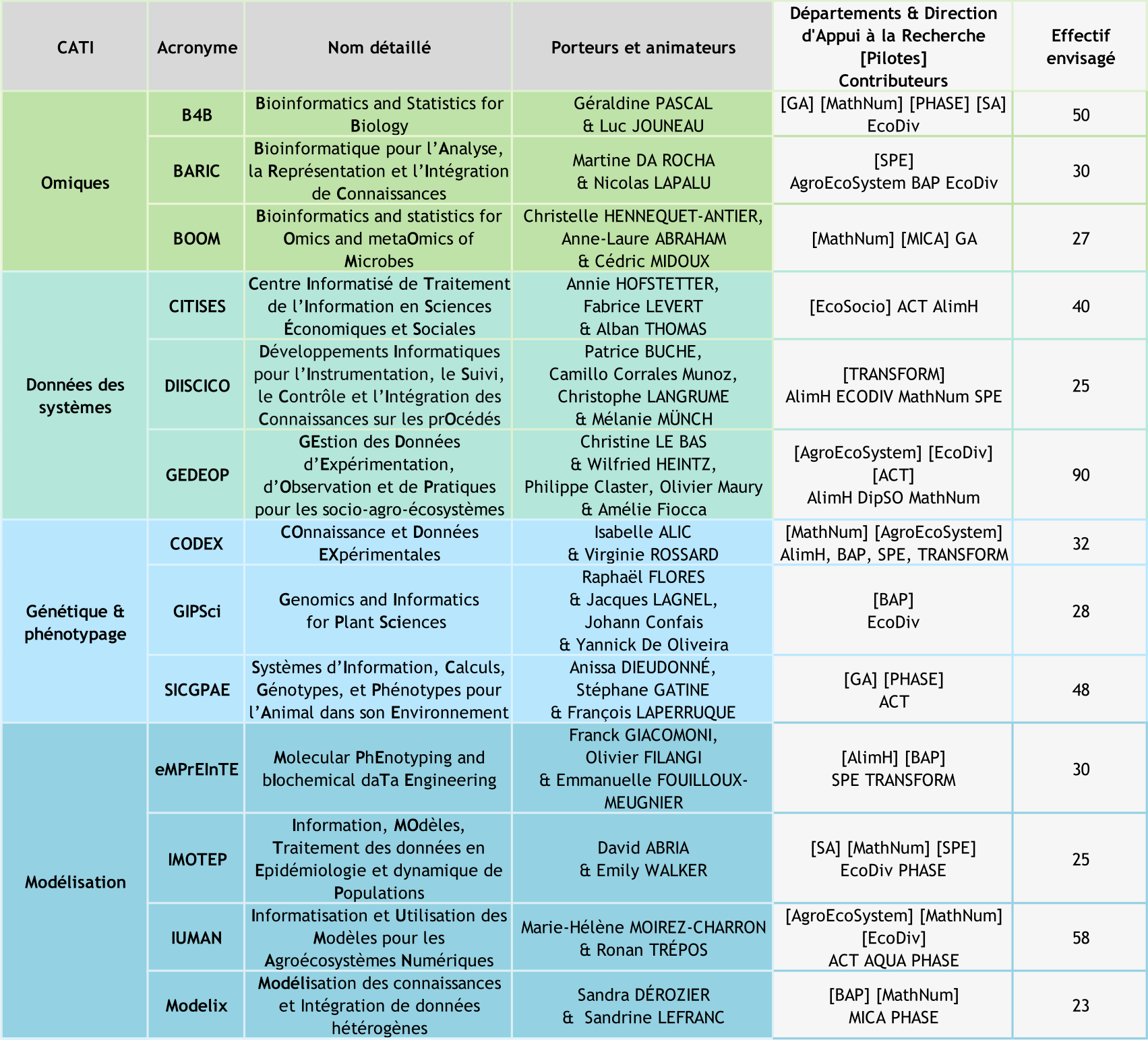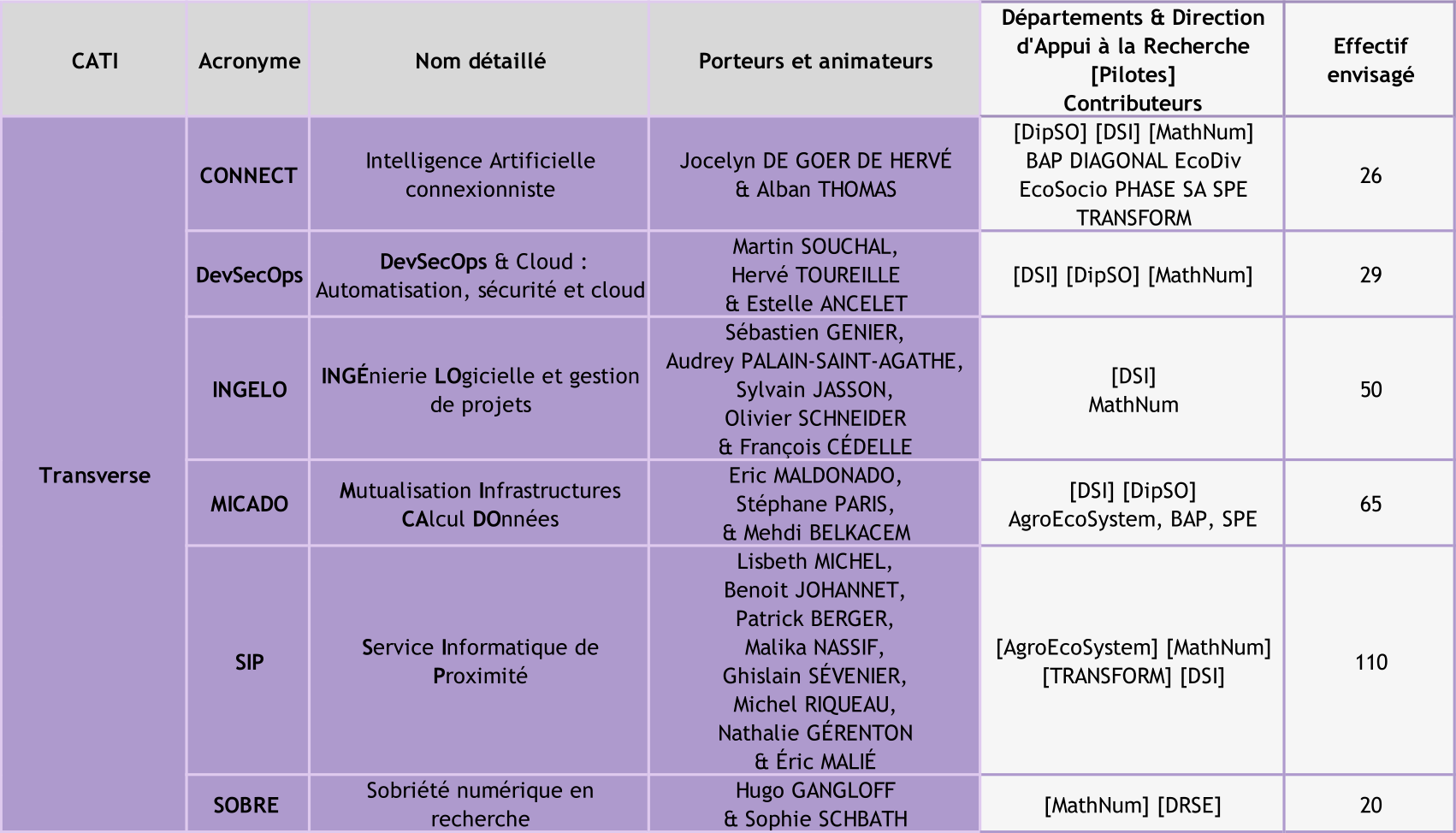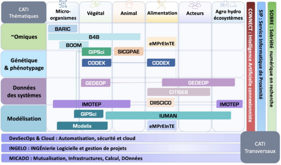 Parmi l’ensemble des 19 CATI, 12 s’inscrivent dans la continuité, voire la reconduction, de CATI-3G existants, témoignant ainsi de la maturité de leurs enjeux, objectifs et modes de fonctionnement. De plus, il y a eu la proposition de 5 nouveaux CATI (CONNECT, DevSecOps, INGELO, MICADO et SOBRE), et 2 CATI (GIPSci et SICGPAE) sont issues de fusion de 4 CATI-3G .